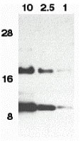 Western blot analysis of eotaxin in HeLa cell lysate containing 10, 2.5, or 1 ng of full length recombinant eotaxin with eotaxin antibody at 1 μg/mL.