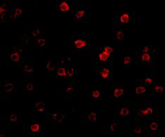 Immunofluorescence of DR3 in Jurkat cells with DR3 antibody at 20 μg/mL. |