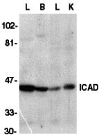 Western blot analysis of ICAD in mouse lung (L), brain (B), liver (L), and kidney tissue lysate with CAD antibody at 1:1000 dilution. |