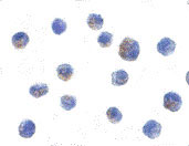 Immunocytochemistry of IKK alpha in Jurkat cells with IKK alpha antibody at 10 μg/mL. |