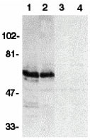 Western blot analysis of SODD in HeLa (1,3) and THP-1 (2,4) whole cell lysates in the absence (1,2) or presence (3,4) of blocking peptide with SODD antibody at 1:500 dilution.