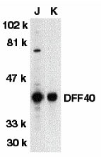 Western blot analysis of DFF40 in Jurkat (J) and K562 (K) whole cell lysate with DFF40 antibody at 1:500 dilution.