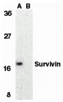 Western blot analysis of survivin in MOLT4 cell lysate in the absence (A) or presence (B) of blocking peptide with survivin antibody at 1 μg/mL.
