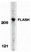 Western blot analysis of FLASH in HeLa whole cell lysate with FLASH antibody at 0.5 μg/mL.