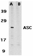 Western blot analysis of ASC in HL60 whole cell lysate in the absence (A) or presence (B) of blocking peptide with ASC antibody at 1 μg /ml.