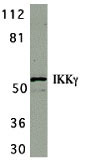 IKK gamma Antibody: Nuclear factor kappa B (NF-κB) is a ubiquitous transcription factor and an essential mediator of gene expression during activation of immune and inflammatory responses. NF-κB mediates the expression of a great variety of genes in response to extracellular stimuli. NF-κB is associated with IκB proteins in the cell cytoplasm, which inhibit NF-κB activity. The IκB kinase (IKKα and IKKβ) phosphorylates IkB and mediates NF-κB activation. A novel molecule in the IKK complex was recently identified and termed IKKγ/NEMO/FIP3/IKKAP1. IKKγ interacts with IKKβ and is required for the activation of IKK complex and NF-κB by LPS, PMA, TNF, and IL-1 stimulation. FIP3 was also shown to bind to RIP and NIK and to mediate TNF-induced NF-κB activation.