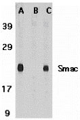 Western blot analysis of Smac in mouse heart tissue lysate in the absence (A) or presence (B) of blocking peptide and in rat heart tissue lysate with Smac antibody at 1 μg /ml.
