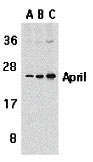 Western blot analysis of APRIL expression in Jurkat cells with APRIL antibody at 1 μg/mL (A), 2 μg/mL (B), and 4 μg/mL (C).