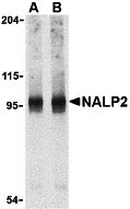 Western blot analysis of NALP2 in PC-3 cell lysate with NALP2 antibody at (A) 1 and (B) 2 μg/mL. |