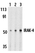 Western blot analysis of IRAK-4 in HeLa cell lysate with IRAK-4 antibody at 1 (lane 1), 2 (lane 2), and 4 (lane 3) μg/mL, respectively.