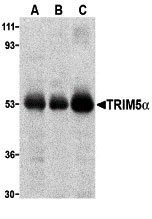 TRIM5 alpha Antibody: TRIM5 is a member of a broad family of otherwise unrelated proteins defined by the presence of a tripartite motif containing a RING domain, a B-box type 1, and a B-box type 2, followed by a coiled-coil region. TRIM5 has six alternately spliced isoforms, the longest of which is the alpha variant which also contains a carboxy-terminal B30.2 (SPRY) domain. Expression of TRIM5α variants from humans, rhesus monkeys, and African green monkeys enabled resistance to infection by various retroviruses including HIV-1, albeit at differing efficiencies. All TRIM5α variants could inhibit at least two different retroviruses, but not from those viruses isolated from the same species, suggesting that TRIM5α acts as a natural barrier to cross-species retrovirus transmission.