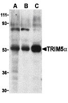 TRIM5 alpha Antibody: TRIM5 is a member of a broad family of otherwise unrelated proteins defined by the presence of a tripartite motif containing a RING domain, a B-box type 1, and a B-box type 2, followed by a coiled-coil region. TRIM5 has six alternately spliced isoforms, the longest of which is the alpha variant which also contains a carboxy-terminal B30.2 (SPRY) domain. Expression of TRIM5α variants from humans, rhesus monkeys, and African green monkeys enabled resistance to infection by various retroviruses including HIV-1, albeit at differing efficiencies. All TRIM5α variants could inhibit at least two different retroviruses, but not from those viruses isolated from the same species, suggesting that TRIM5α acts as a natural barrier to cross-species retrovirus transmission.