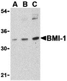 Western blot analysis of BMI-1 in K562 cell lysate with BMI-1 antibody at (A) 0.5, (B) 1 and (C) 2 μg/mL.