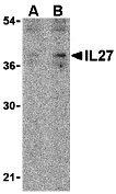 Western blot analysis of IL-27 in EL4 lysate with IL-27 antibody at (A) 2 and (B) 4 μg/mL.