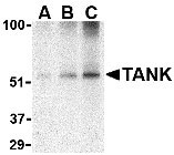Western blot analysis of TANK in Daudi cell lysate with TANK antibody at (A) 0.5, (B) 1 and (C) 2 μg/mL.