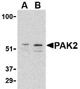 Western blot analysis of PAK2 in Jurkat lysate with PAK2 antibody at (A) 0.5 and (B) 1 μg/mL.