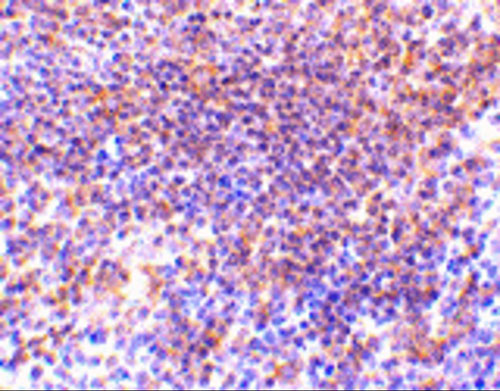 Immunohistochemistry of PAK2 in mouse spleen tissue with PAK2 antibody at 10 μg/mL.