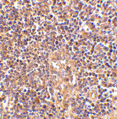 Immunohistochemistry of ATM in human lymph node tissue with ATM antibody at 2.5 μg/mL.
