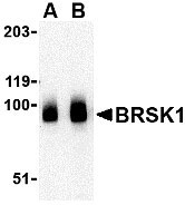 Western blot analysis of BRSK1 in human brain tissue lysate with BRSK1 antibody at (A) 0.5 and (B) 1 μg/mL.