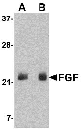Western blot analysis of FGF4 in NIH 3T3 cell lysate with FGF4 antibody at (A) 0.5 and (B) 1 μg/mL.