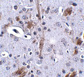 Immunofluorescence of TTBK1 in Human Brain tissue with TTBK1 antibody at 20 μg/mL. |