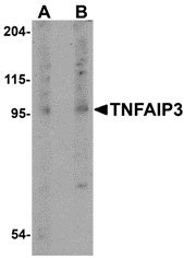TNFAIP3 Antibody: TNFAIP3, also known as A20, is located in chromosome band 6q23, a region that is often deleted in B cell lymphomas. Recently, it was identified as a tumor suppressor gene in Hodgkin lymphoma and several subtypes of non-Hodgkin lymphomas. TNFAIP3 was initially identified as a zinc-finger protein that is rapidly and transiently induced by TNF-α, inhibiting NF-κB-dependent gene expression, and protecting cells from TNF-α-cytotoxicity. Overexpression of TNFAIP3 also inhibits the TLR2- and TLR4-mediated interleukin-8 synthesis in airway epithelial cells, suggesting that TNFAIP3 also acts as a negative regulator of TLR-mediated inflammatory responses, thereby protecting the host against harmful over-responses to pathogens. At least two isoforms of TNFAIP3 are known to exist.