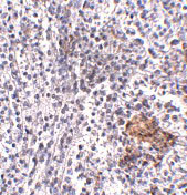 Immunohistochemistry of SHOC2 in human spleen tissue with SHOC2 antibody at 5 μg/mL. |