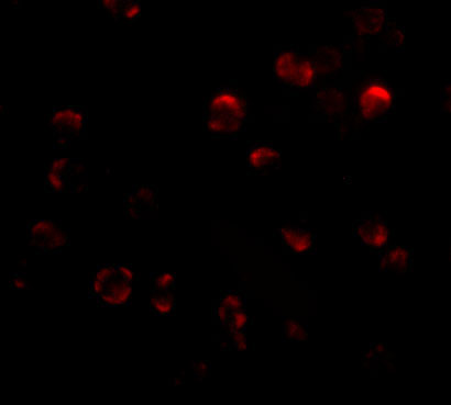 Immunofluorescence of KLHL15 in HeLa cells with KLHL15 antibody at 20 μg/mL. |