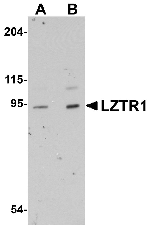 Western blot analysis of LZTR1 in human heart tissue lysate with LZTR1 antibody at (A) 1 and (B) 2 μg/mL.