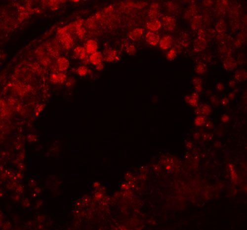 Immunofluorescence of CRISP in human testis tissue with CRISP antibody at 20 μg/mL. |