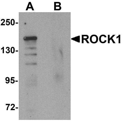 Western blot analysis of ROCK1 in 293 cell lysate with ROCK1 antibody at 1 μg/mL in (A) the absence and (B) the presence of blocking peptide.