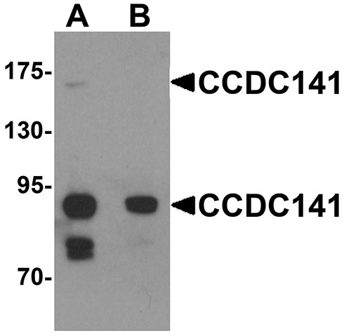 Western blot analysis of CCDC141 in SK-N-SH cell tissue lysate with CCDC141 antibody at 1 μg/mL in (A) the absence and (B) the presence of blocking peptide