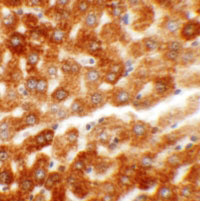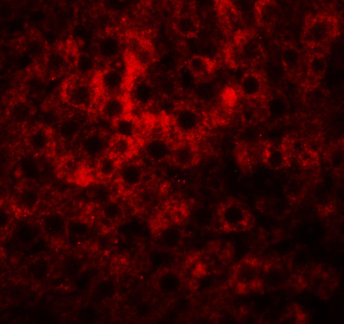 Immunofluorescence of HDGFRP2 in rat liver tissue with HDGFRP2 antibody at 20 μg/mL. |