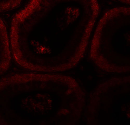 Immunofluorescence of SPATA3 in mouse testis tissue with SPATA3 antibody at 20 μg/mL. |