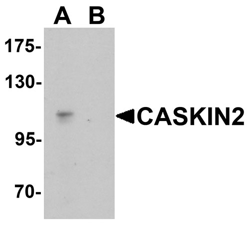Western blot analysis of CASKIN2 in Hela cell lysate with CASKIN2 antibody at 1 μg/mL in (A) the absence and (B) the presence of blocking peptide.