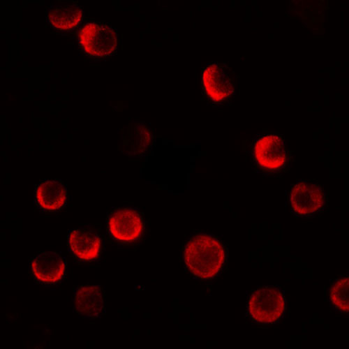 Immunofluorescence of CASKIN2 in HeLa cells with CASKIN2 antibody at 20 μg/mL. |