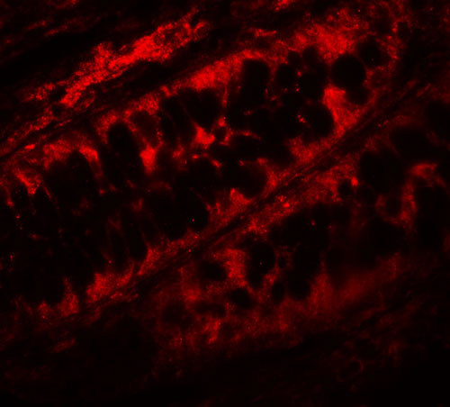 Immunofluorescence of Periphilin in human colon tissue with Periphilin antibody at 5 μg/mL. |