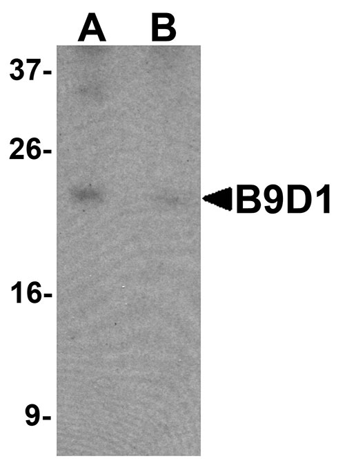 Western blot analysis of B9D1 in 293 cell lysate with B9D1 antibody at 1 μg/mL in (A) the absence and (B) the presence of blocking peptide.
