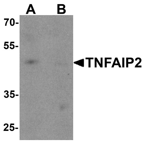 TNFAIP2; At least two isoforms of TNFAIP2 are known to exist; this antibody will detect both isoforms. This antibody is predicted to not cross-react with TNFAIP3.