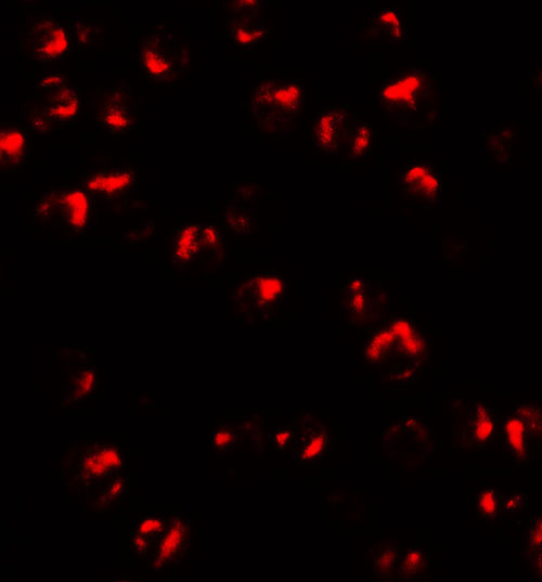 Immunofluorescence of TNFAIP2 in K562 cells with TNFAIP2 antibody at 20 μg/mL. |