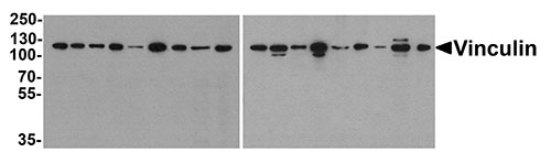 VCL; Vinculin antibody is human, mouse, rat, rabbit and chicken reactive. At least three isoforms of Vinculin are known to exist.