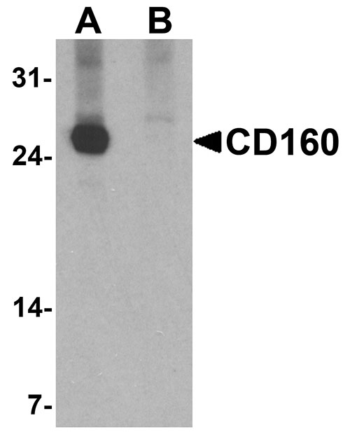 Western blot analysis of CD160 in K562 cell lysate with CD160 antibody at 1 μg/ml in (A) the absence and (B) the presence of blocking peptide.