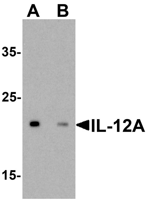 Western blot analysis of IL-12A in HeLa cell lysate with IL-12A antibody at 0.5 μg/ml in (A) the absence and (B) the presence of blocking peptide. |