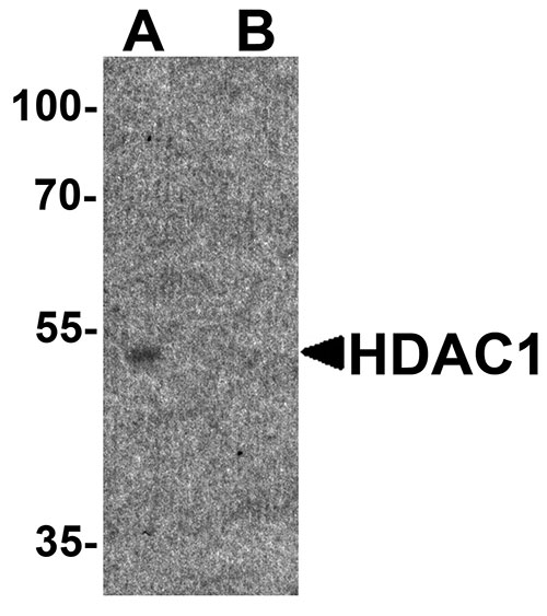 Western blot analysis of HDAC1 in human brain tissue lysate with HDAC1 antibody at 1 μg/ml in (A) the absence and (B) the presence of blocking peptide. |