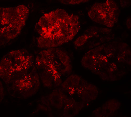 Immunofluorescence of XKR8 in human stomach tissue with XKR8 antibody at 20 μg/ml. |
