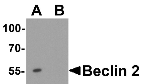 Western blot analysis of Beclin 2 in Jurkat cell lysate with Beclin 2 antibody at 1 μg/ml in (A) the absence and (B) the presence of blocking peptide.
