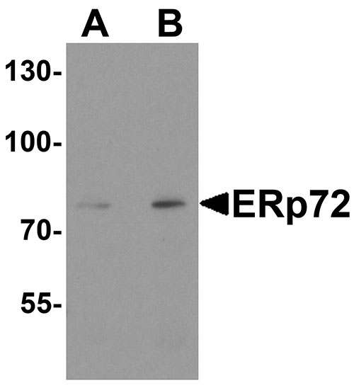 Western blot analysis of ERp72 in human colon tissue lysate with ERp72 antibody at (A) 1 and (B) 2 μg/ml.