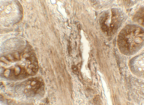 Immunofluorescence of ERp72 in rat colon tissue with ERp72 antibody at 20 μg/mL. |