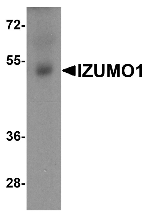IZUMO1; IZUMO1 antibody is human specific. At least four isoforms of IZUMO1 are known to exist; this antibody will detect the two longest isoforms.