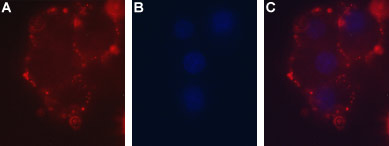 Expression of P2X2 in rat PC12 cells Immunocytochemical staining of intact living rat pheochromocytoma cell line (PC12). A. Extracellular staining of cells with Anti-P2X2 Receptor (extracellular) antibody (APR00493G), (1:50) followed by goat anti-rabbit-AlexaFluor-594 secondary antibody. B. Staining of cells with DAPI used as the counterstain. C. Merged images of A and B. |